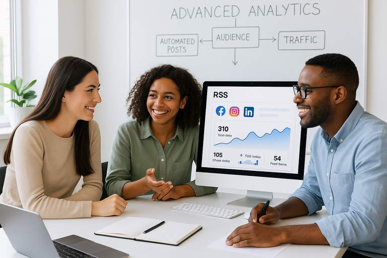 Economize tempo e nunca perca uma atualização: compartilhe instantaneamente os artigos, podcasts ou vídeos mais recentes de qualquer fonte RSS no Facebook, Instagram, X, TikTok e muito mais - com as mãos livres e sempre dentro do cronograma.